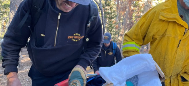 I had noticed a hiker in the distance as I started down the hill, and immediately started screaming for help at the limit of my vocal capacity. My hoarse cry, alarming to my ears in its desperation. If only I had a whistle.  Another litany of “what ifs” plaguing my pain addled mind as I quietly hoped for a responding call. I had water and a fleece layer, which I immediately covered myself with, the shock already setting in with uncontrollable shaking. I’m not actually sure my teeth had ever chattered before. My knees certainly on a ski run in Chamonix, but my teeth? It’s funny how so many experiences you read about that you can’t actually picture, are surprising in their accuracy when it happens to you. I tried not to panic. They were coming. 911 had been reached. I had also finally gotten a text out to my friend Jen who lived in Mammoth, and my boyfriend back in Los Angeles, so they at least knew where I was, if search and rescue failed to find me.