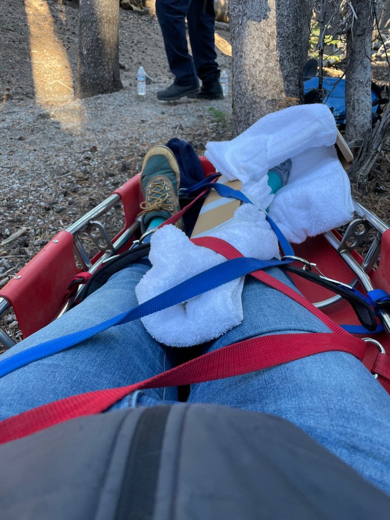 Two of the team gently splinted my leg, wrapping my foot in soft towels and then surrounding it with cardboard, taping the whole ensemble together. There was chatter on the phones (I’m guessing they had the same service as 911?!) as discussions were had about how to get me the hell out of there. They had arrived on site with a mono-wheeled litter. Imagine a fat ATV tire with a red plastic stretcher precariously balanced on top. Now I was officially scared.