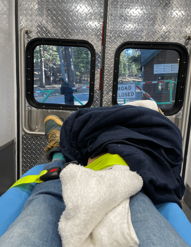 I gripped the sides of the sled as they started rolling me over the uneven terrain. One of the benefits of the mono-wheel is that they could roll you over boulders and logs. Sounds FINE right? NOPE. The litter pitched from side to side as each of my rescuers stepped and climbed about the rocky slope. I was fully and unapologetically white knuckling the red plastic of the stretcher as we climbed up the rocky terrain, each little jingle jangle sending an electric bolt up my strapped in leg. I had my eyes peeled for ice, imagining the rescuers slipping on that same stubborn culprit and taking a second spill down the slope.